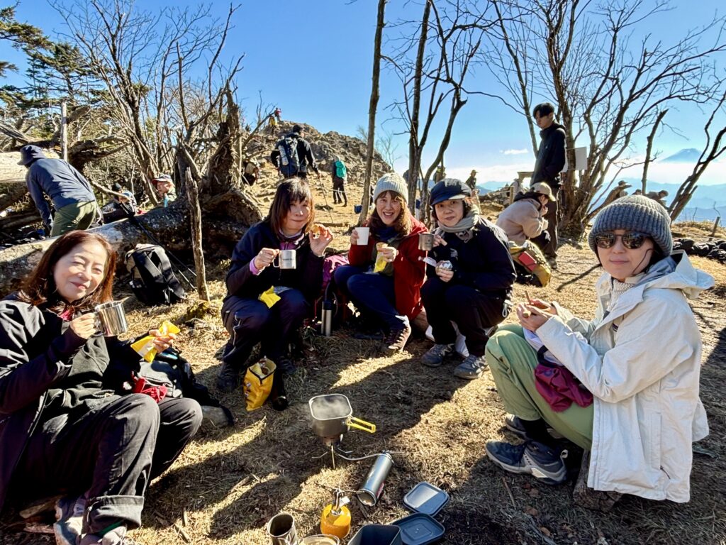 上日川峠の登山口から登り始めました。福ちゃん荘から唐松尾根に入ると、徐々に勾配がきつくなります。景色がひらけたあたりに差し掛かるといくつかの急登もあります。けっして楽な登りではありませんが、この夏、北アルプスにも登られたというみなさま。さすがに足取りはしっかりされています。みなさんで談笑しながら、あっというまに雷岩に到着。そこから山頂まで足を伸ばした後は、お楽しみのコーヒータイム。私は地元・飯能で山好きのご夫婦が経営されているやまびより珈琲のコーヒーを楽しんでいただくつもりで、ドリップバックを準備。しかし、なんとザックにコーヒーを入れ忘れていたという大失態。楽しみにしていたコーヒータイムは、私が自分で飲もうと思っていた別のコーヒーをみんなで分けて飲んでいただいたという思い出になりました。